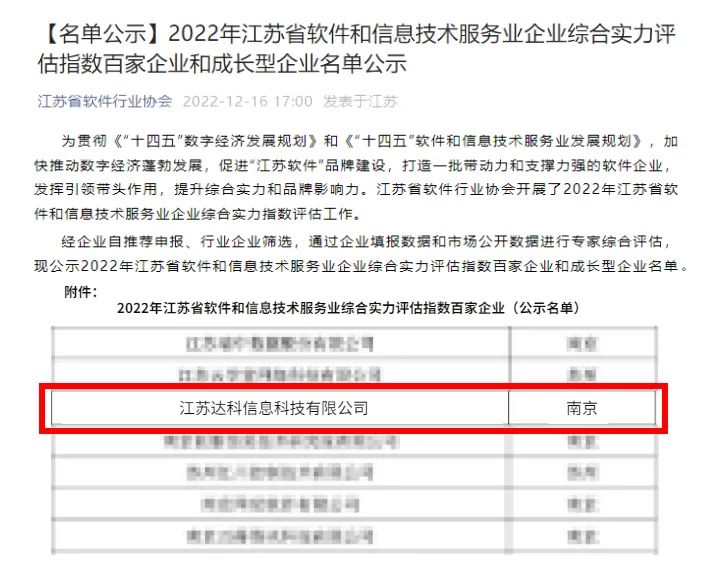 动态 | 江苏达科入选2022年江苏省软件和信息技术服务业企业综合实力评估指数百家企业名单