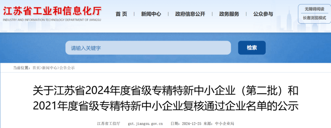 2024年12月25日,江苏省工业和信息化厅发布了《关于江苏省2024年度省级专精特新中小企业(第二批)和2021年度省级专精特新中小企业复核通过企业名单的公示》,江苏达科数智技术有限公司凭借在技术创新、市场拓展、产品质量等方面的卓越表现,荣获“2024年度省级专精特新中小企业”称号。